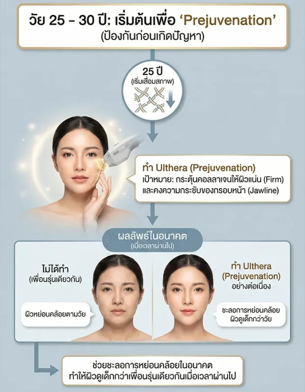 หลายคนอาจสงสัยว่าอายุยังไม่ถึง 30 ต้องทําแล้วหรือ? ในความเป็นจริง คอลลาเจนในผิวจะเริ่มเสื่อม สภาพลงตั้งแต่อายุ 25 ปีเป็นต้นไป การทํา Ultherapy ในวัยนี้คือการ “ป้องกันก่อนเกิดปัญหา”