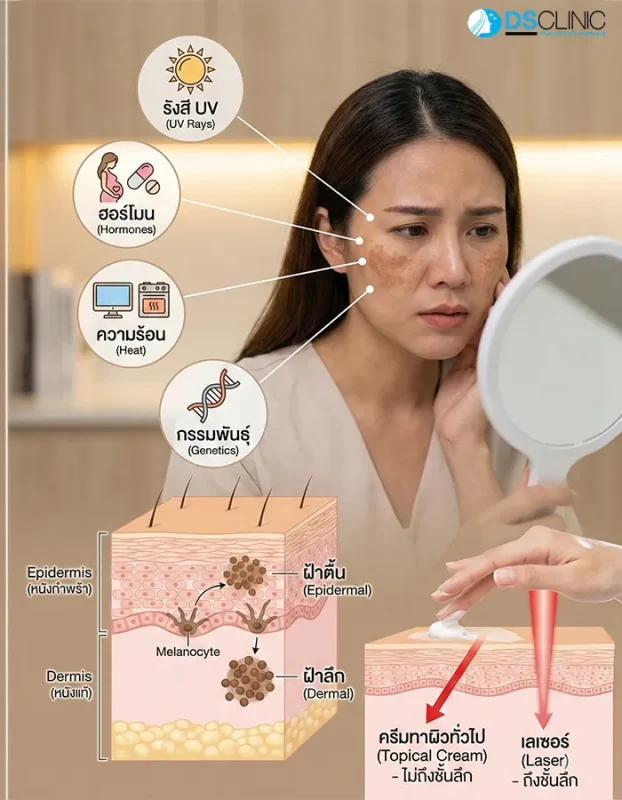 ก่อนจะไปดูเรื่องเลเซอร์ เราต้องเข้าใจศัตรูของเราก่อน ฝ้าเกิดจากการทำงานที่ผิดปกติของเซลล์สร้างเม็ดสี (Melanocytes) ในชั้นผิวหนัง ซึ่งถูกกระตุ้นโดยปัจจัยหลักๆ คือ