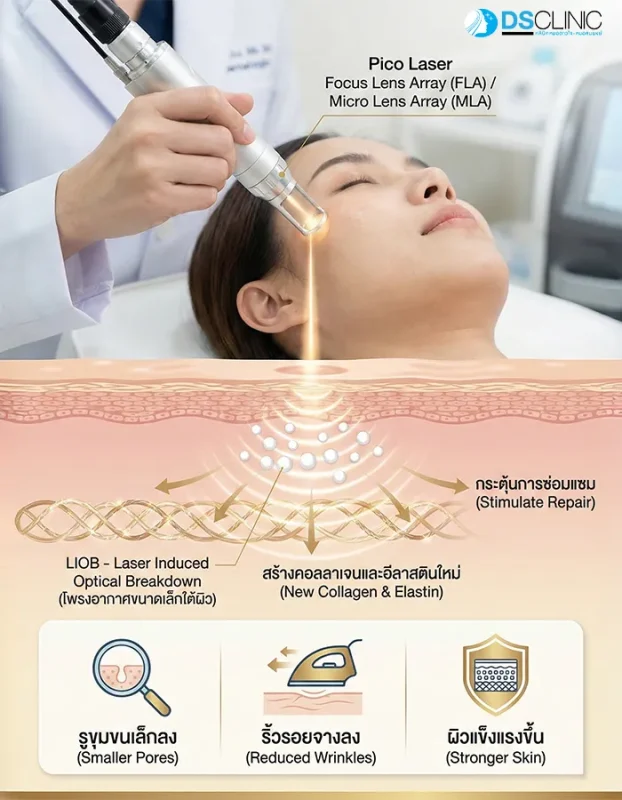 ในอดีต เลเซอร์จะใช้หลักการ Photo-thermal คือการใช้ความร้อนเข้าไปเผาเม็ดสี แต่ Pico Laser เปลี่ยนมาใช้หลักการ Photo-acoustic หรือแรงดันมหาศาลที่เกิดขึ้นในเสี้ยววินาที เข้าไป “กระแทก” เม็ดสีให้แตกละเอียดเป็นอนุภาคเล็กๆ (Dust-like particles)