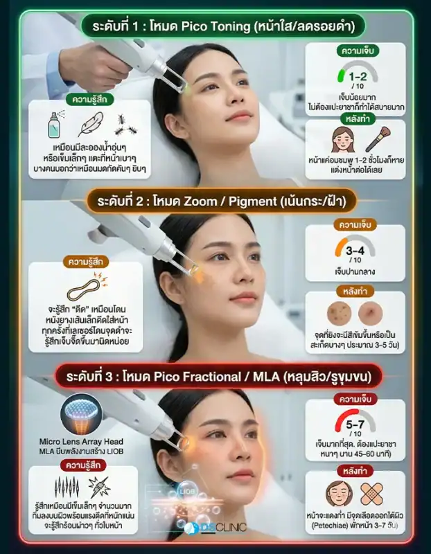 ความเจ็บของ Pico Laser ไม่ใช่ค่าคงที่ค่ะ แต่มันขึ้นอยู่กับว่าคุณหมอ “ยิงเพื่อรักษาอะไร” โดยแบ่งออกเป็น 3 ระดับหลักๆ ดังนี้