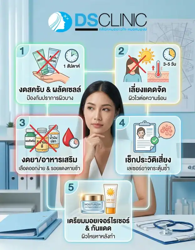 หยุดใช้กลุ่ม AHA, BHA, Retinol หรือการสครับหน้าแรงๆ เพื่อไม่ให้ปราการผิวบางเกินไปก่อนรับเลเซอร์