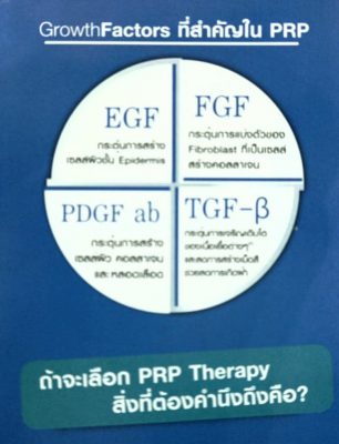 เป็นองค์ประกอบของ Growth Factor ทั้งหมด 11 ชนิด จากเลือดของเราเองหลายๆคนนะคะ เวลามีแผลมีดบาดหรือมีแผลถลอก สังเกตง่ายๆเวลาที่แพ้เราใกล้หายนั้น หรือกำลังซ่อมแซมตัวเอง ก็จะเห็นว่ามีน้ำเหลืองออกมารอบๆเล็กๆซึมออกมาตามบาดแผล ที่เกิดขึ้นจากร่องรอยบาดเจ็บ หรือรอยถลอกนั้นๆนั่นเอง จึงเข้าใจง่ายๆว่านั้นแหละคือ การรักษาด้วยการซ่อมแซมตนเอง หรือเรียกว่า PRP ซึ่งแทนที่เราจะทำให้ร่างกายเราเกิดบาดแผลขึ้นมาแบบนั้นขึ้นมา เสี่ยงกับการบาดเจ็บ วิธีการง่ายๆก็คือ การนำเลือดออกมาด้วยการเจาะเลือด เหมือนเวลาเราไปโรงพยาบาล เพื่อทำการตรวจเลือดตามปกติ และนำไปปั่นแยกและทำให้เกิดเป็นชั้น PRP ขึ้นมา แล้วก็นำฉันนั้นกลับมาฉีดให้กับร่างกายของเราเอง ในจุดที่เราต้องการซ่อมแซมแล้วก็ฟื้นบำรุงรักษา