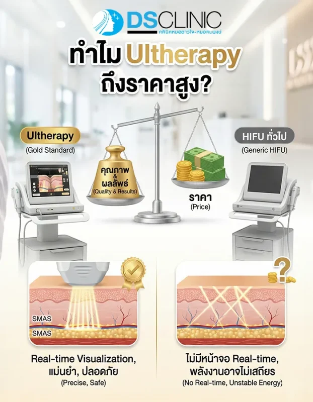 ข้อควรระวัง: อย่าหลงเชื่อ Ultherapy ราคาถูกเกินจริง เพราะความเสี่ยงของเครื่องปลอมคือ “พลังงานไม่คงที่” ซึ่งอาจทำให้หน้าไหม้ (Burn) หรือเส้นประสาทอักเสบได้