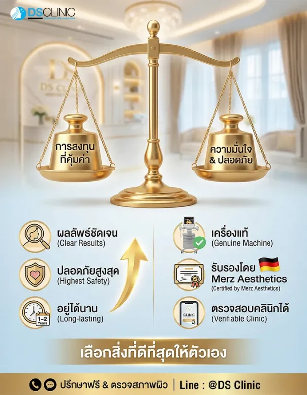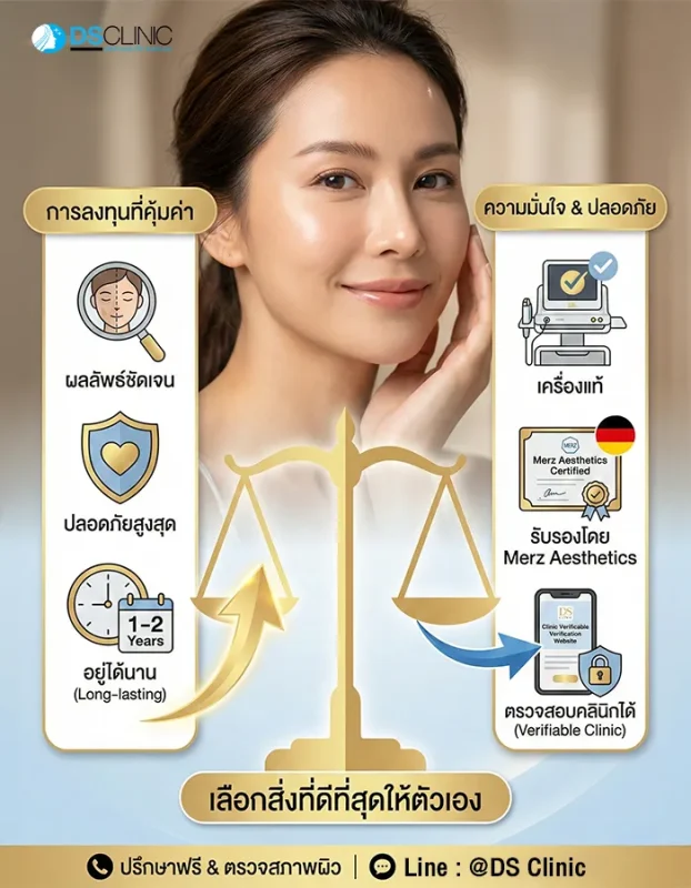- ความน่าเชื่อถือของคลินิก: คลินิกที่ได้มาตรฐานและใช้เครื่องแท้จะมีใบเซอร์ติฟิเกตยืนยันจาก Merz Aesthetics